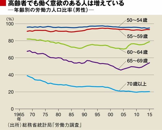 農林水産業従事者や商店などの自営業者の比率が低下してきたために、70歳以上の男性を見ると労働力人口(働く意欲と能力のある人)比率は緩やかな低下傾向にある。しかし、60〜65歳の層では高年齢者雇用安定法の制定や改正の効果による労働力人口比率の上昇がみられる。同法の直接の効果がない65〜70歳の層でも労働力人口比率は反転して上昇し始めている。日本では、働く場所さえ提供されれば、もっと多くの高齢者が働こうとするだろう。