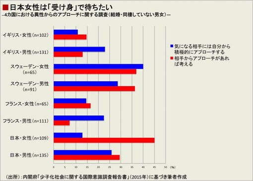しかし、この形式は国際的に見て必ずしも多数派とは言えません。「告白」とはややずれますが、内閣府は、2015年に日本、フランス、スウェーデン、イギリスの20〜40代男女(未婚・既婚混在)を対象に「気になる相手には自分から積極的にアプローチするか」を調査しました(「少子化社会に関する国際意識調査報告書」)。