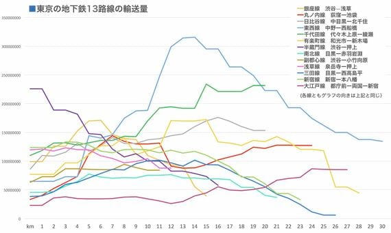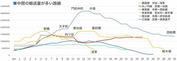 路線の中間でもっとも輸送量が多いタイプは、銀座線、丸ノ内線、東西線、有楽町線、南北線、三田線。都心部に向かって両側から利用者が増加していく、折れ線グラフにすると山型を描くタイプの路線だ。