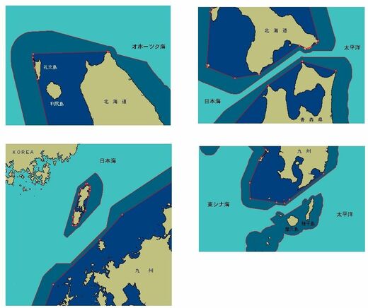 しかし、これらの海幅は通常なら12カイリのところを3カイリに狭めているため、「公海」となる海域は外国艦船が自由に通行できる。