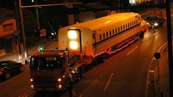 両車、メインのドライバーが2人に、後方のタイヤ操作をする「舵切り」という役目のスタッフが2人ずつ。これに運転助手等スタッフが3人ずつ。これらは日通中部重機建設の社員。さらに1号車、2号車にそれぞれ先導車、後導車、後方警戒車が3台ずつ続く。こちらの人員は8名で、外注の警備会社が担当する。あたかも深夜の新幹線輸送キャラバン隊といったところだ。「ブルルゥーンッ!」と、地響きのような音が鳴り響き、いよいよ大型トレーラーのエンジンがかかりスタートである。