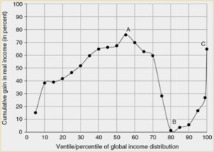 慶応義塾大学総合政策学部の神保謙准教授は、雇用そのものではなく、米国や英国などの先進国の中間層で募っている不満や滞留を指摘する。具体的には、神保准教授はエコノミストのブランコ・ミラノビッチ氏が示した「グローバル化の象のカーブ」(横軸を世界の人々の所得階層、縦軸を1998~2008年の所得の伸び率とする折れ線グラフ)を挙げる。