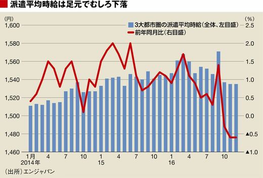 気になる動きもある。派遣大手のエンジャパンの調べでは、2016年12月の派遣平均時給は1535円、3カ月連続で前年同月比マイナスに沈んだ。同社では「昨年10月の社会保険に関する法改正の影響で、介護関連職を中心に、夫が扶養控除を受けられる範囲内で働くように就業調整をする主婦層が多かったせい」と分析している。
