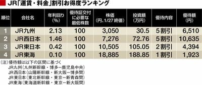 まず、JRから見ていこう。上場している東日本、西日本、東海、九州の4社とも年1回、優待割引券を100株ごとに1枚発行している。各社とも1枚につき運賃・料金の割引を1回受けられるという内容だ。割引率は各社によって大きく異なる。西日本と九州が5割引なのに対し、東日本は2割引、東海は1割引だ。