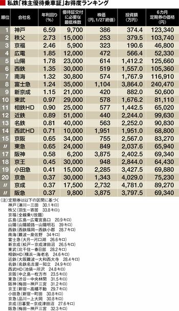 なお、今回のランキング作成では回数券を除いたが、相鉄ホールディングス(HD)では、必要な最低株式数を保有している株主に対して乗車証に加え回数券を80枚発行することは付記しておきたい。大半の会社において回数券発行はせいぜい数枚~40枚にとどまる中、80枚は破格だ。