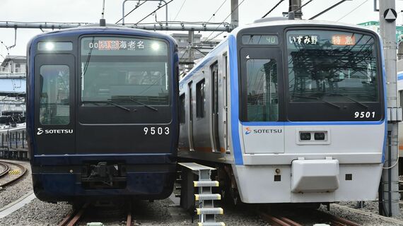 相模鉄道の電車。ネイビーブルー(左)へのリニューアルが進んでいる(撮影:風間仁一郎)