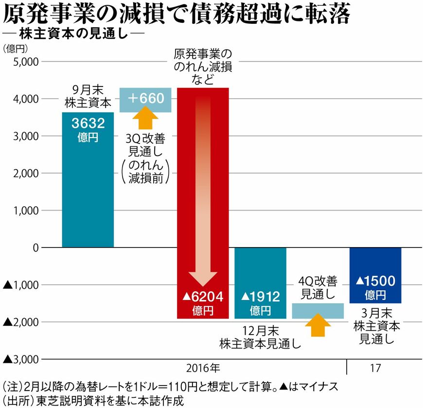 メモリなど原発以外の事業は総じて好調なため、通年で赤字額は多少縮小する。それでも、今後の資産売却などがなければ2017年3月末の株主資本は1500億円のマイナスが見込まれる。