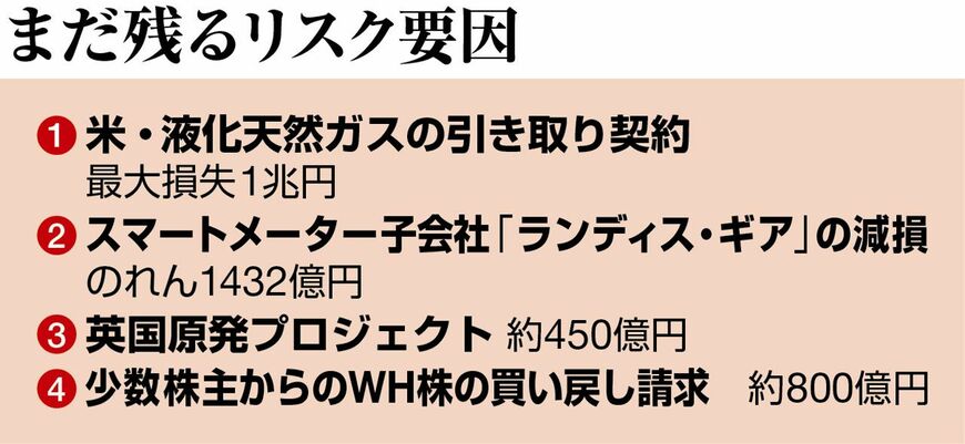 2011年に産業革新機構と共同出資したスイスのスマートメーターメーカー、ランディス・ギアは業績が期待に届いていない。さらに東芝は英国で原発計画を進めており、その先行きも危ぶまれている。WHに3%出資しているIHIなど少数株主から株の買い戻しを請求されるリスクもある。脆弱な財務体質では一部の顕在化にも耐えられない。