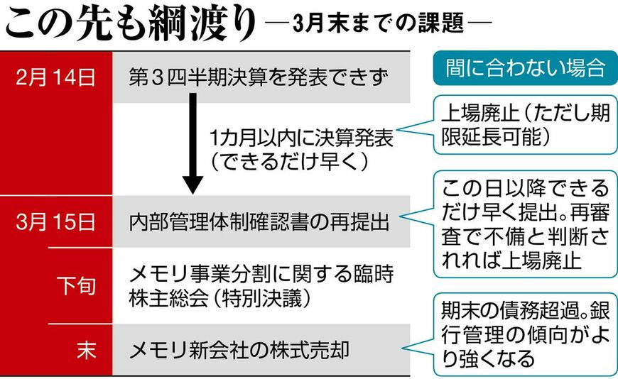メモリ事業売却も綱渡り。売却の前提となる分社には、3月下旬に臨時株主総会で出席株主の議決権の3分の2以上の賛成を得る「特別決議」が必要になるからだ。その手続きと並行して交渉を進め、3月末までに売却を完了するのは至難の業だ。東芝も3月末に間に合わないことを覚悟しているフシがある。売却できなければ債務超過は解消されない。