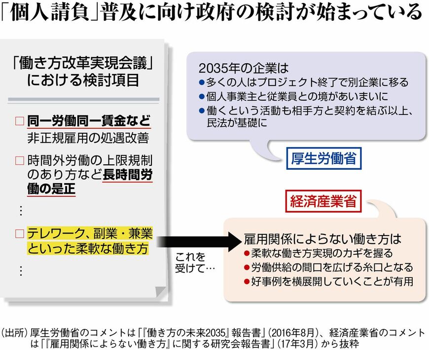 それでも政府が月内に取りまとめる「働き方改革実行計画」には、「個人請負」の普及に向けた検討・対策が、一定程度盛り込まれる見通しだ。