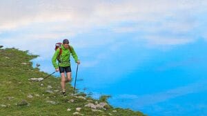 70. ノルディックウォーキングは2本のポール(杖)を使って歩くスタイル。通常のウォーキングに比べ足の負担を約10~20%、膝の関節や脊椎にかかる負担を約5キログラム軽減