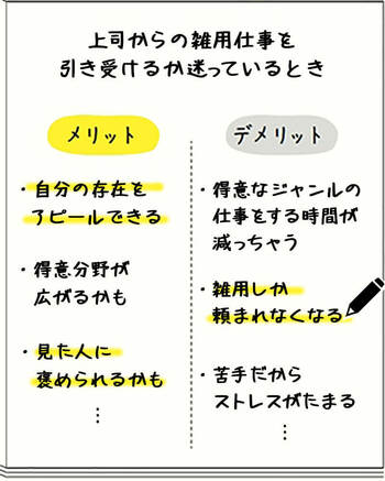 「天秤ノート」のつけ方は簡単。まず、ノートの真ん中に線を1本書いて、やるか迷っていることのメリットとデメリットをそれぞれ書き出します。このノートは人に見せるものではないので、とにかく、どんな細かいことでもいいので思いつくかぎり箇条書きで書き出します。