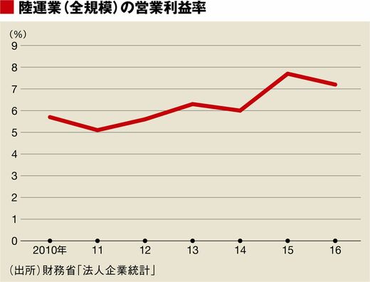 先日、財務省の法人企業統計で2016年10~12月期の各社経営状況が明らかになった。そこで、資本金規模を問わず、陸運業全規模の営業利益率を見てみよう。2010年~2016年にかけて5~7%台で推移している。