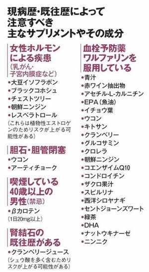 効果を高めるにはそれなりの使い方もあるが、サプリは「食品」なので1日の摂取量だけが表示され、効果的な使い方を明示することもできない。適正な使用のためには、薬を服用中の場合の相互作用やアレルギーのチェックは欠かせない。