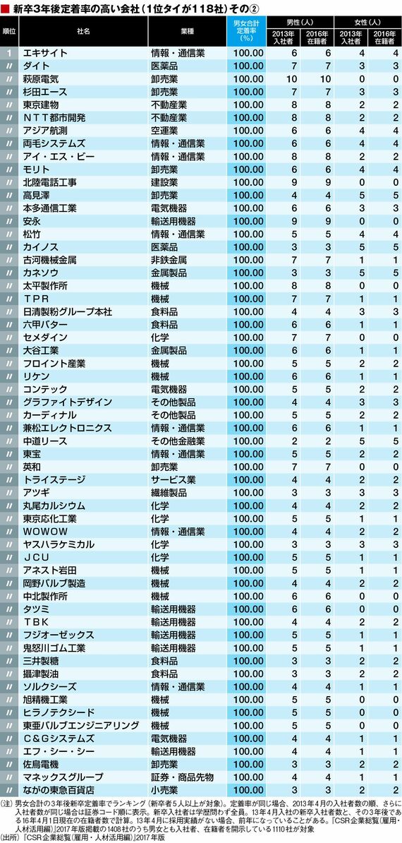 この3社を含む定着率100%の118社を業種別にみると、化学が15社と最も多く、機械14社、電気機器13社、情報・通信業11社、卸売業10社と続く。その大半が新入社員数30人以下の企業だ。おおよそどの企業も、その規模からすれば大量採用することはできないが、採用した新入社員をしっかり育て、戦力として活躍してもらうという姿勢が見て取れる。