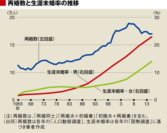 その一方で、再婚数を同じタームで比較すると、1972年の12万件から、2015年の17万件と、1.4倍になっています。婚姻全体に占める再婚の割合も、11%から27%へとほぼ3倍に増えています。言ってみれば、日本の婚姻数は、再婚者によって支えられているわけです。なお、再婚数が増えているのは当然離婚数が増えているからです。
