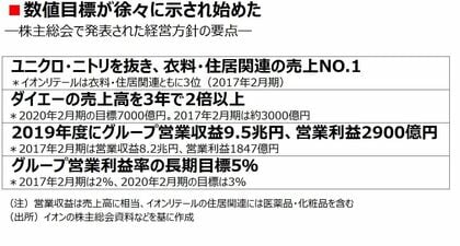 ただ、事業ごとの目標は示されず、先行きは依然として不透明だ。ニトリに匹敵するという住居関連品の売上高に医薬品・化粧品が含まれているなど、今回の岡田社長の説明にはやや説得力に欠ける部分もあった。さらに一歩踏み込んだ具体策の発表が待たれる。