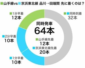 以上を始発から終電まで集計すると、山手線と京浜東北線が同時に品川を出発するのは64本。そのうち田端に同時に到着するのは32本とちょうど半分。京浜東北線のほうが1分速く到着するのは10本、2分早着が10本。