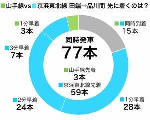 田端→品川に関しては、山手線と京浜東北線が同時に田端を出発する77本のうち、品川に同時に到着するのは15本、京浜東北線のほうが1分速く到着するのは28本、2分早着が24本、3分早着が7本。