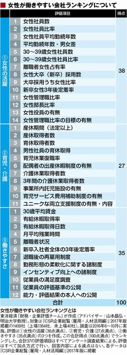 ランキングは「女性の活躍」「育児・介護」「働きやすさ」の3分野、合計37項目(100点満点)で評価。『CSR企業白書』2017年版に上位500社を掲載している中から、上位100社を紹介する。