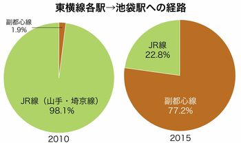 直通運転開始前の2010年には渋谷でJR線(山手線・埼京線など)への乗り換えが98%、残り2%が副都心線経由だったが、2015年は77.2%が副都心線経由、22.8%がJR線経由と逆転した。乗り換えなしの威力はやはり大きいようだ。