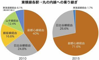 副都心線経由で東横線と直通運転を行う、東武東上線や西武池袋線沿線への経路の変化はもっと極端だ。2010年の時点では、西武池袋線へは渋谷からJR線経由が100%、東武東上線へはJR線経由が68.2%、副都心線経由が31.8%だった。だが、2015年の調査結果ではどちらの路線へも副都心線経由が100%となっている。
