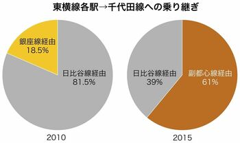 明治神宮前で副都心線と連絡する千代田線各駅へのルートは、2010年には81.5%が日比谷線経由だったのが、2015年には39%まで減少し、61%が副都心線経由となった。