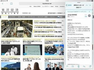 また、画面を分割して2つのアプリを表示する「Slide Over」にアプリが対応している場合、Dockからドラッグで表示中のアプリ内にアイコンを移動させると、縦長の小さな画面で起動する。この状態では、2つのアプリを切り替えながら利用できる。Slide Over中のアプリを上方向にドラッグすると、「Split View」として画面を2つに分割可能。アプリ間のドラッグ&ドロップにも対応しているため、メールに画像を添付したり、メールを見ながらカレンダーに予定を入れたりといったことも、簡単に行える。
