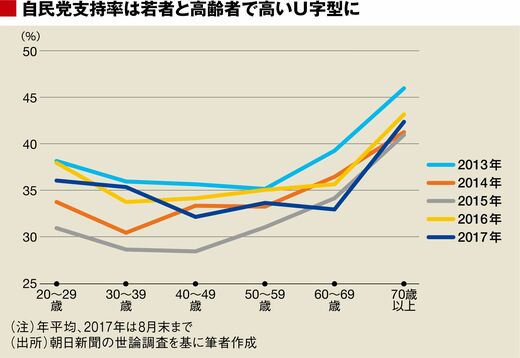 自民党支持率は若者・高齢者で高く、中堅で低い