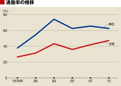 日本の小・中学生の通塾率は、1970年代に比べ明らかに上昇している。1976年には中学3年生が4割弱、小学6年生が3割弱だったのに対し、2012年では、中学3年生では6割強、小学6年生では5割弱に上る。