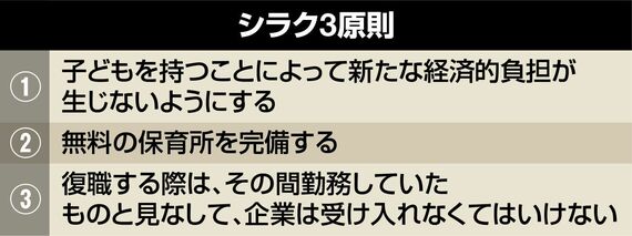 出口:わたしは、少子化対策の基本は、出生率を2.0までに回復させたフランスの「シラク3原則」(下表)の実行につきると考えています。この原則に照らすと、育児休業がキャリアの中断というのはおかしいし、ましてやランクダウンなどはあってはならないことです。