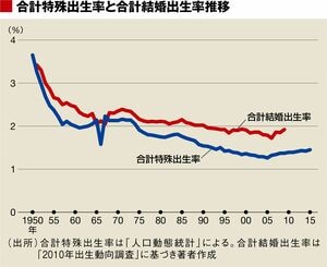 グラフからは、合計結婚出生率はそれほど下がってはいないことがわかります。1990年代以降2.0を超えたことはありませんが、それでもずっと1.7~1.9レベルで持ちこたえています。つまり、結婚した夫婦は合計2人弱の子どもを産んでいるということになるのです。逆の見方をすれば、結婚数が1つ増えれば、その分だけ期待出生値がプラス2となるわけで、既に2人の子どもを産んでいる女性に3人目を求めるより、未婚女性の結婚を促進した方が少子化解決に効くと考えられます。