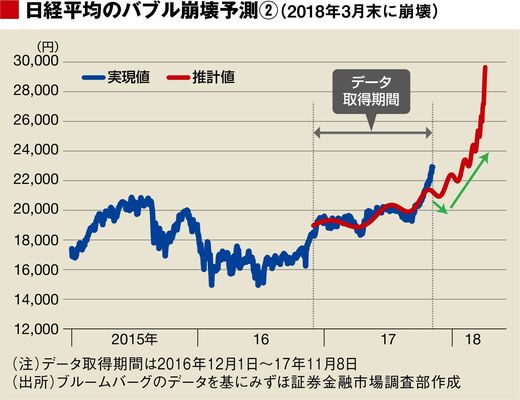 他方、2018年3月以降のバブル崩壊の可能性を考えるため、さらにバブル崩壊のタイミングを変化させてモデルを推計したところ、2018年3月以降はモデルの「均衡」が変わり、決定係数が大幅に上昇した。2018年3月末に崩壊すると仮定したモデル推計の結果、2017年末に株価が一度「調整」され、その後再び臨界点に向かっていくパターン(均衡状態)が示された。