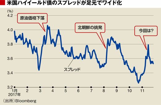 米国ハイイールド市場のスプレッドのワイド化=債券価格の下落は今年に入ってから2回ほどみられたが、いずれも理由がはっきりしていた。3月は原油の下落で、8月は北朝鮮の地政学リスクである。