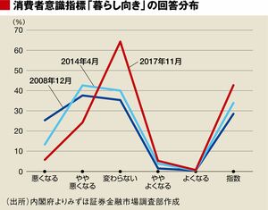 消費者意識指標のうち「暮らし向き」の回答分布の変化をみると、足元で指数を押し上げてきたのは「変わらない」の回答比率の増加でほとんどが説明できる。