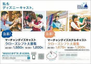 2017年の11月以降、キャストの採用を担う東京ディズニーリゾート キャスティングセンターが近隣の住宅地などに求人チラシを投函。物販施設の19時以降のクローズシフトを募る「急募」という表現からは、クリスマスシーズンや年末年始の繁忙期に向けた採用への切迫感も感じられる。