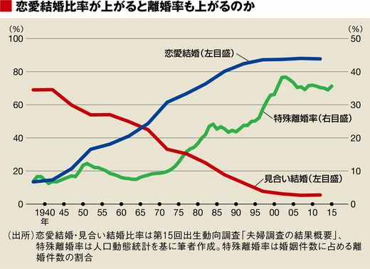 もちろん「恋愛結婚が増えると離婚が増える」という因果関係までは断定できませんが、お見合いで結婚した夫婦より恋愛結婚の夫婦のほうが離婚しやすいというのは興味深いデータです。