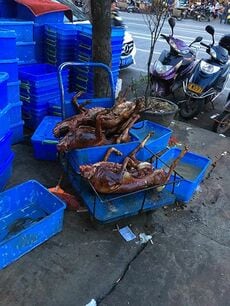ただ、お店の軒先に犬肉を吊るして肉切り包丁でバンバンと捌いている。ふと横を見ると、路上に丸焼きになった犬肉がゴロゴロと転がっている。隠す気はないようだ。