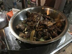 品数は少なく、犬鍋だけだった。ぶつ切りにした犬肉をあまがらいタレと野菜で和えた料理だ。韓国の犬肉料理に比べて、臭みが少なく食べやすかった。ただ、かなり乱雑に切ってあるため骨や筋も多い。
