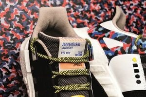 問題の定期券は写真を見るとわかるように、靴のタン(ベロ)に縫い付けてある。「Jahresticket」とは「年間乗車券」の意味で、これでベルリン市全域(同市の料金タリフのゾーンAとB)を走るあらゆる公共交通機関に2018年の年末まで自由に乗ることができる。ゾーンAとBをカバーする年間乗車券は現在で1枚761ユーロ(約10万03000円)だが、今回のコラボ靴はなんとその5分の1にあたるわずか180ユーロ(約2万4000円)で売り出された。そもそも切符としても安い、しかもアディダスの靴、とあって、注目を浴びないはずがない。