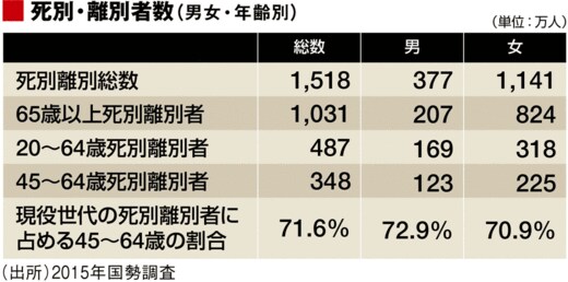 2015年国勢調査によれば、配偶者との死別・離別によるソロ人口は男女あわせて約1500万人存在します。そのうち女性が1140万人と圧倒的多数を占めていますが、死別による高齢独身女性が大半です。