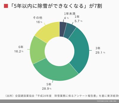 これに人手不足などが重なった結果、約7割が「5年後(2021年度)までには除雪が続けられなくなる」と答えた。
