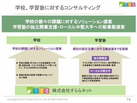 湯野川:そうですね。だから、最近は補習塾だけではなく、ICTを活用した変革に迫られているローカルな中堅・大手塾でも「すらら」が採用され始めています。課題はさまざまですね。「地方なので人口が少なくなっている地域の採算悪化が進んでいる」とか「講師採用が本当にできなくなってきた」とか。そこでたとえば「その地域の校舎ではアルバイト講師を用いずに『すらら』だけで指導するコンパクトな塾に業態転換しませんか? それによって、損益分岐点が○○%下がりますよ」と提案しているのです。