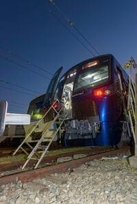 20000系は東急線直通用の車両であり地下トンネル断面の規格から先頭部には非常扉を備える(撮影:杉山 慧)