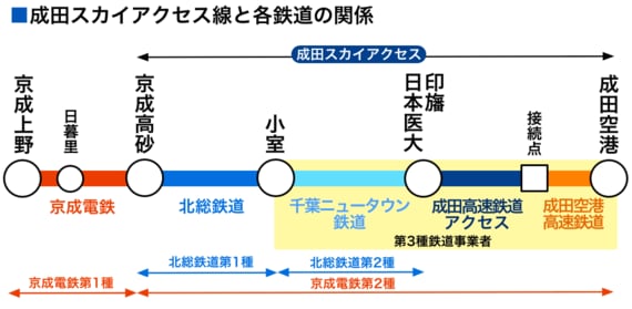 成田スカイアクセス線の鉄道会社の関係は複雑だ。下図にその関係を示した。