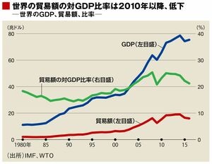 世界のGDPと貿易額の比率も2010年代に入って低下する動きがみられるようになった。