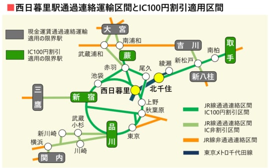 また、東京地下鉄(東京メトロ)千代田線北千住駅―西日暮里駅間の前後の区間で、JR東日本線を現金運賃で利用する場合は、同区間の前後のJR線の営業距離を通算して運賃を計算できる通過連絡運輸が設定されている。