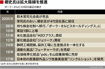 確かにグループ幹部の入れ替えは激しい。2015年には中核子会社のポーラで、訪問販売中心からエステ併設店への転換を主導した鈴木弘樹社長が辞任、後任には当時48歳の横手喜一現社長が抜擢された。低・中価格帯のオルビスでも今年1月、40歳の小林琢磨氏が社長に就任している。件(くだん)の役員も、子会社の社長を辞任させられている。