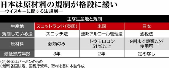 「『ブレンド用アルコール』を使ってもウイスキーを名乗れるというのは、ほかの世界5大産地ではありえない」(評論家の土屋氏)。ベンチャーウイスキーの肥土氏も「この定義のおかげで戦後の物不足の時代にもウイスキーが飲めたという歴史的な背景はあるが、そろそろ見直すべき」と話す。