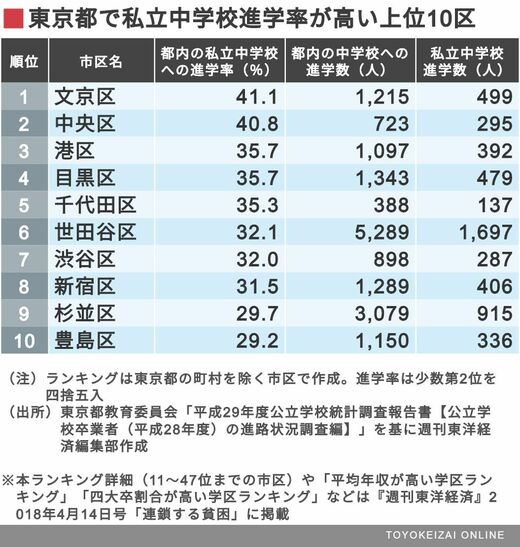 ただ、あくまでも進学率なので受験率はもっと高いだろう。都内の私立中学校が一斉に試験をする2月1日には、文京区や中央区の小学校では「誰も学校に来ない」「クラスで来ていたのは2人だけ」などの声も聞こえてくる。また、前出の女性は「本命校に落ちて、中途半端な私立に行かせるくらいなら中央区立の中学に入れる」といい、受験している人はさらに多いだろう。